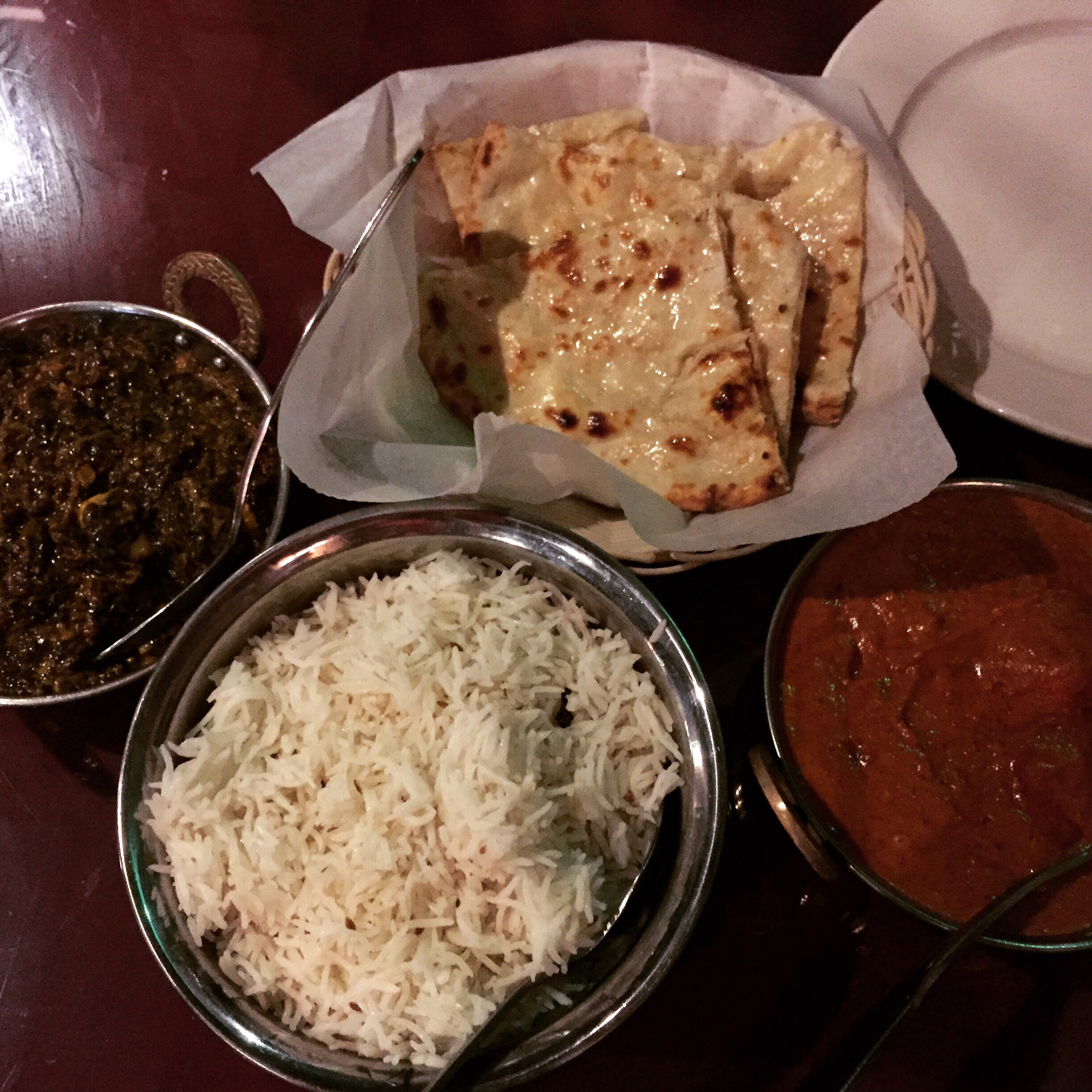 It got great reviews on Urban Spoon, but we were a little nervous pulling up to see a fairly empty parking lot and, once inside, to find only one table of patrons. Fortunately, the restaurant lived up to its reviews. The service was quick and friendly and the food was very good. We started with some peppery papadum and three Indian sauces (one sweet, one savory and one pretty spicy). We then shared a basket of cheese naan, chicken tikka masala and sag paneer (cheese cubes and spinach). We enjoyed the food at Bombay Bay more than some of the Indian restaurants we’ve eaten at in Atlanta.