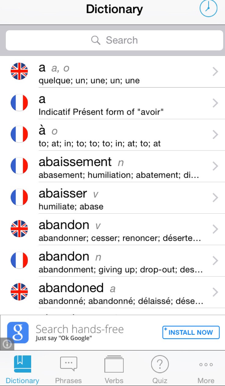 4. French English Dictionary (from VidaLingua). When I want to look up a specific word or phrase, I turn to my French-English dictionary app. In addition to a searchable dictionary, it includes common phrases and audio pronunciations. It also includes a searchable verb list with conjugations and a word quiz. You can download a basic free version that is plenty for just starting out. A full version with even more phrases and terms is available for $9.00.