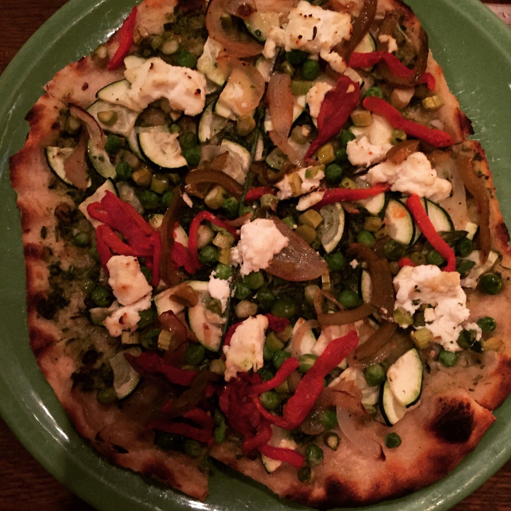 Our main course was a Stone Pie (their version of a pizza) with spring asparagus, herb puree, ricotta cheese, zucchini squash and parmesan. There were a lot more peas on the pizza than asparagus (which surprised us since it wasn’t listed among the ingredients on the menu–and my husband isn’t the biggest fan of peas), but the crust was the thin and crispy style we like and the ricotta melted in our mouths.