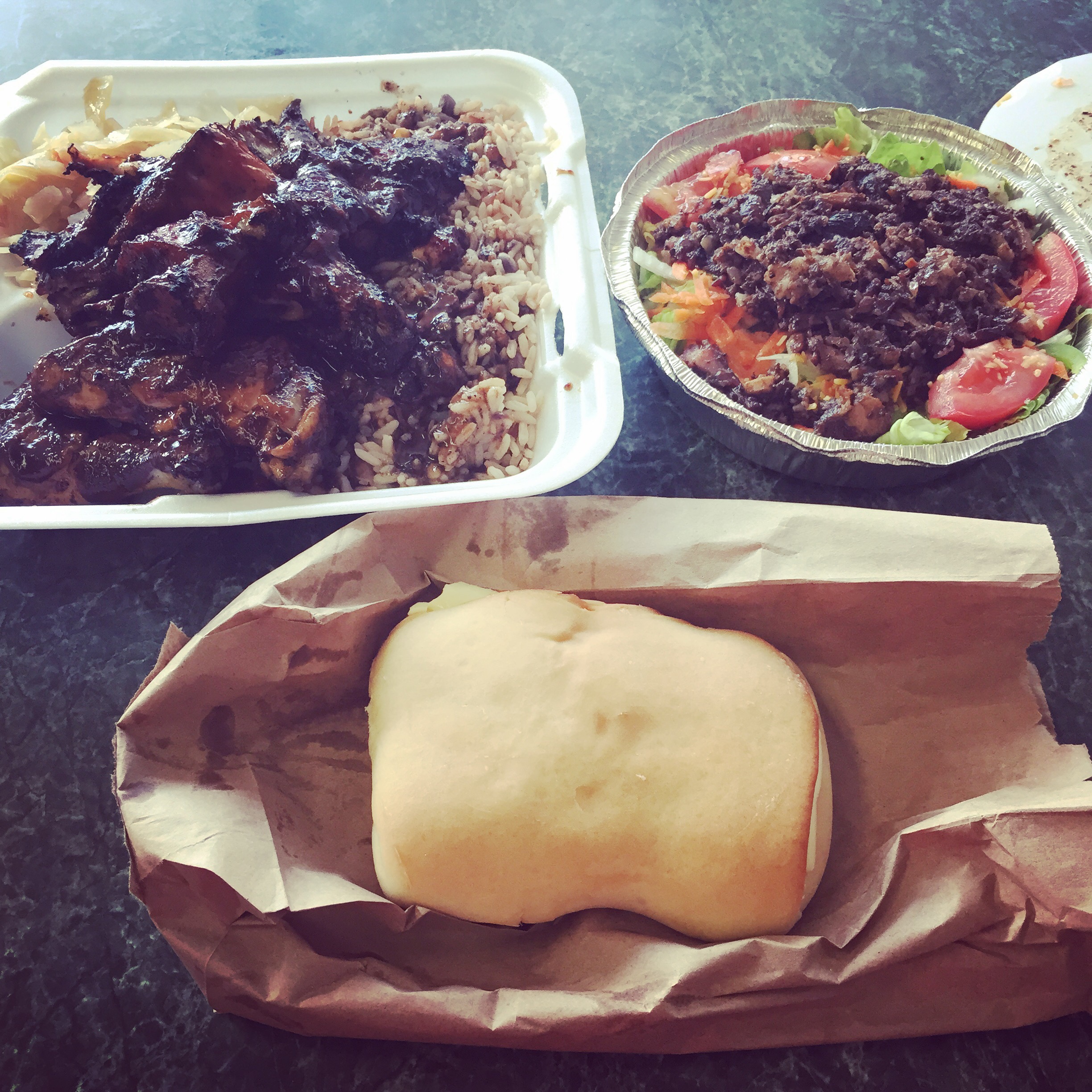 The menu features an array of traditional Caribbean dishes, ranging from jerk chicken and pork to rice and beans. We ordered the reggae chicken (which came with savory rice and beans and buttery cabbage), jerk pork salad (just to make sure we got in some greens) and coco bread with cheese.