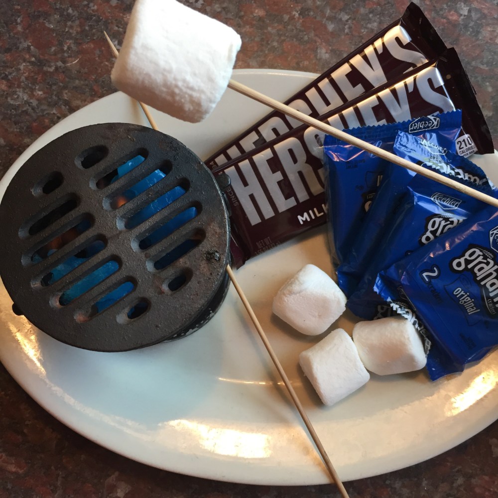 My favorite part about the meal, aside from the great company, was dessert. We ordered the tableside s’mores which came with our own little “campfire,” two Hershey bars and enough marshmallows and graham crackers to make four s’mores. Maybe not the most gourmet of dishes, but it was a lot of fun toasting our own marshmallows and assembling our treats. Mom and Gram shared the peaches and cream cheesecake, which was the runner up in dessert picks for Matt and me.