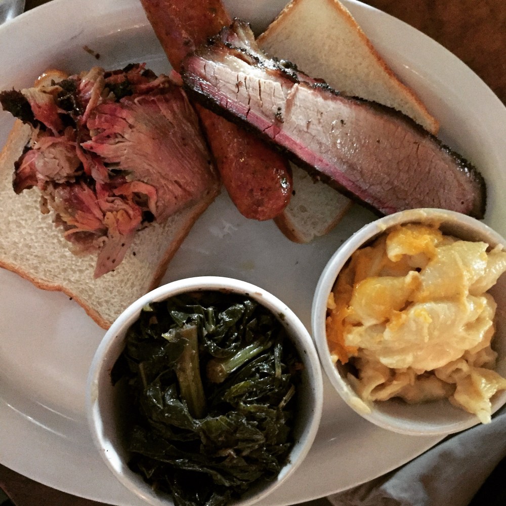 You can’t go wrong with a meat platter at a barbecue joint. This one featured the sausage of the day (a spicy jalapeño number), tender pulled pork and delicious beef brisket.