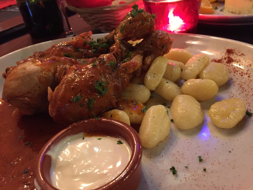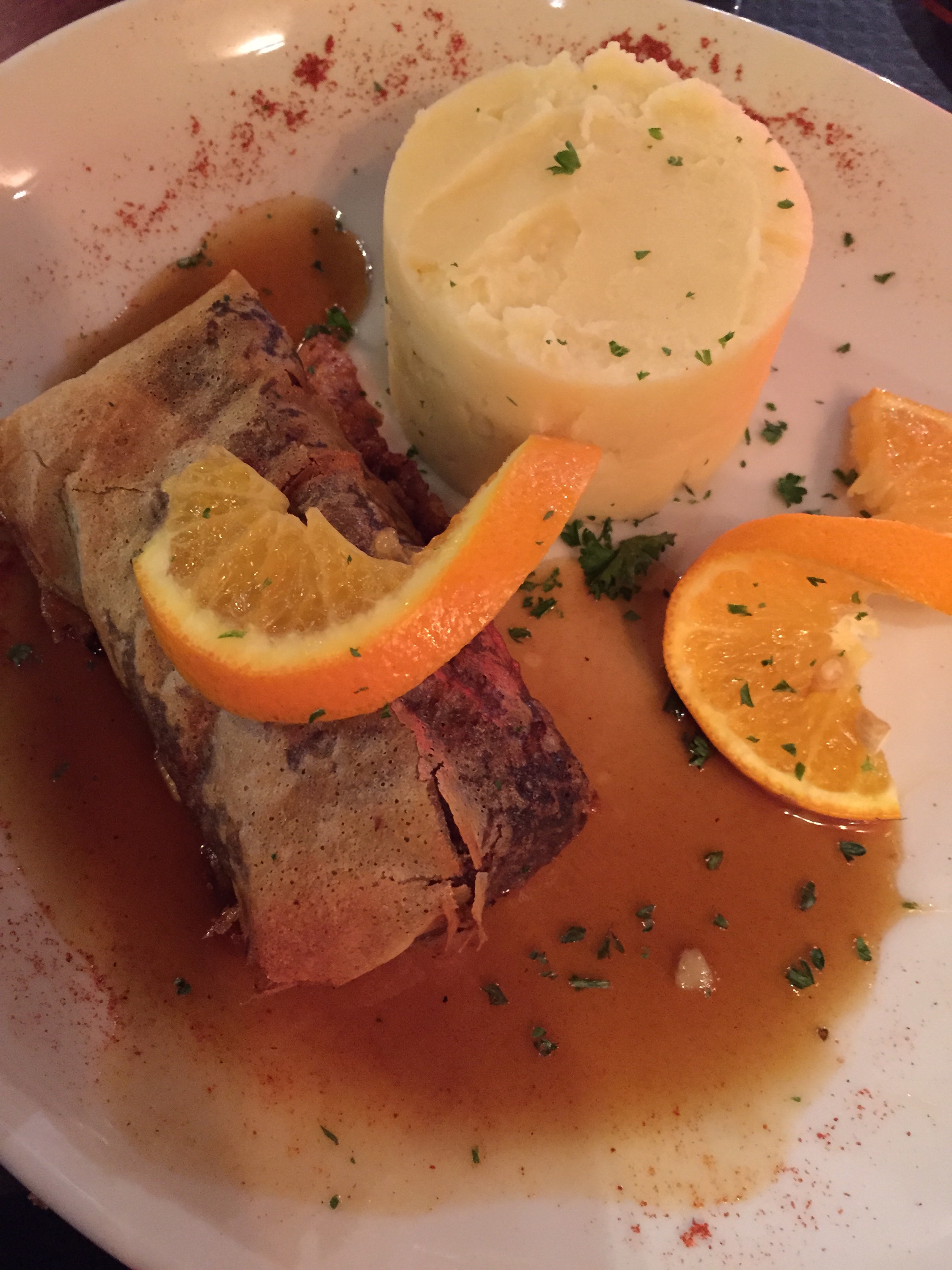 For our main course, I ordered the duck a l’orange and Matt the chicken and gnocchi. My duck came tender and shredded and wrapped in a crispy filo dough. It swam in a pool of jus that was just slightly sweet and contrasted with the saltiness of the duck. The mashed potatoes were creamy and a perfect complement to the meat. We both agreed my dish was the winner.