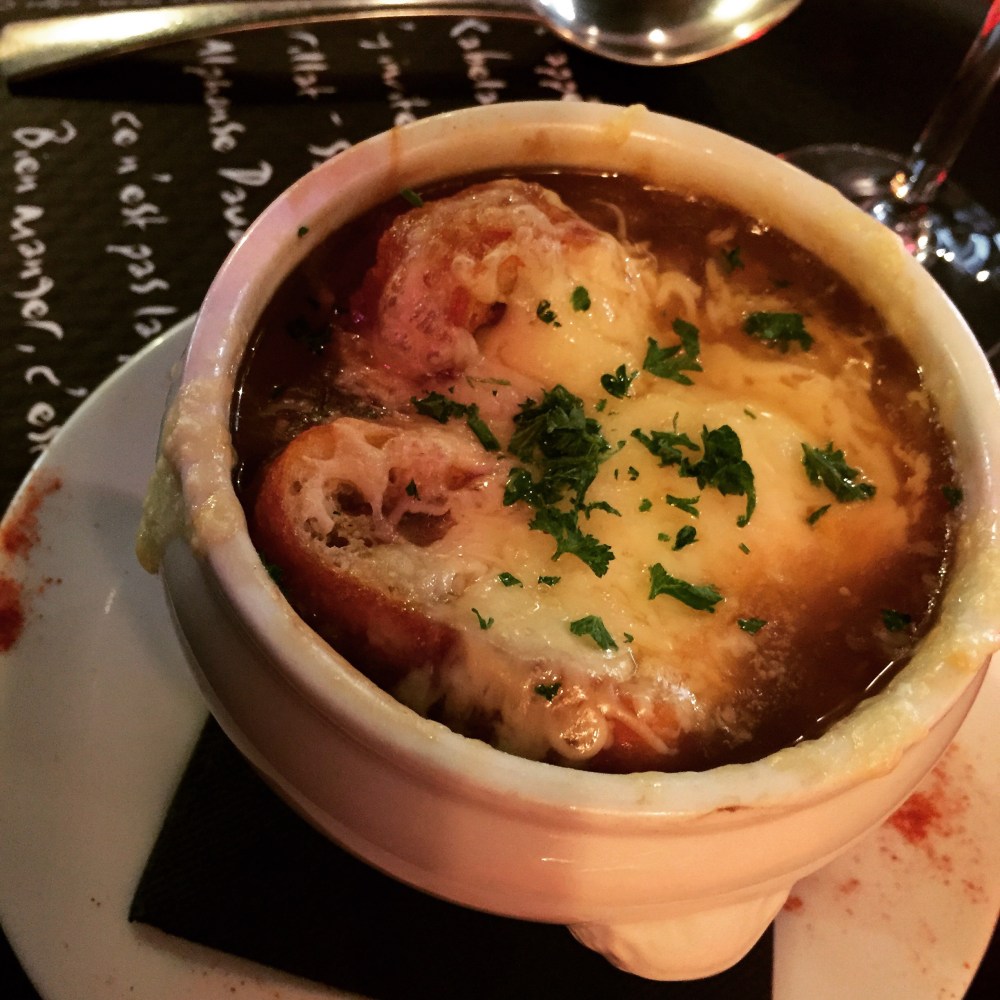 This cute little restaurant featured several different dining options, all including an entrée (or appetizer), plat (what most Americans call the entrée) and dessert. I started with the French onion soup, which happens to be one of my all time favorite soups. To order, I decided to try one of the phrases I learned from my French guide book. It failed. Miserably. The server looked at me, cocked his head and politely said, “I’m sorry, I don’t understand what you’re saying.” Head. On. Table. Fortunately I soon had a glass of wine to cheer me up.