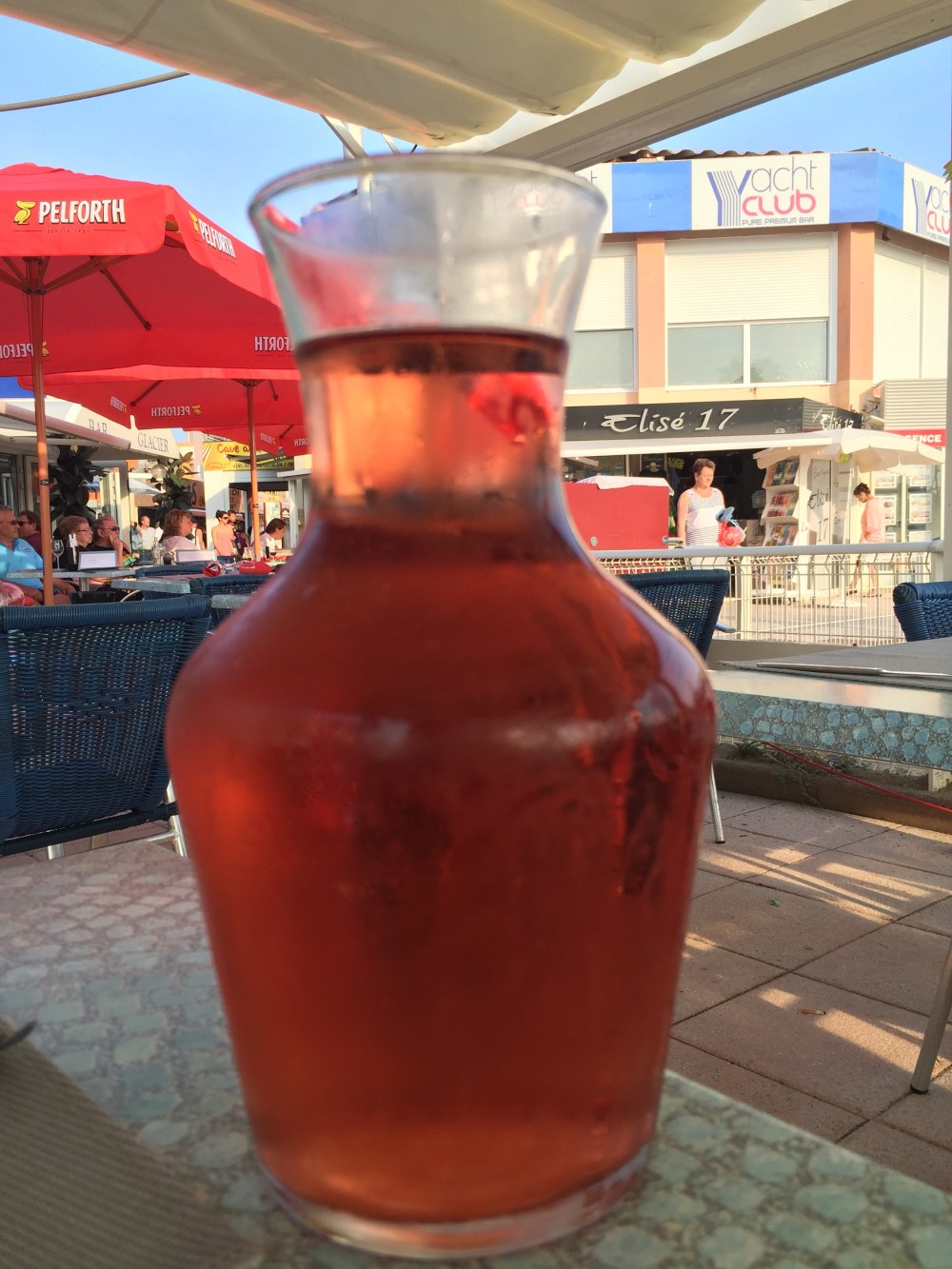 I forgot to bring the extra sunscreen, so after a couple of hours covered head-to-toe with our towels and extra clothes (we burn VERY easily), we decided to head back to town for dinner. We showered (in our tub that had neither door nor shower curtain) and dressed and headed out for a cocktail, opting to stop at a restaurant with a patio overlooking the gorgeous port. We sat for a while watching people and admiring the sailboats and small yachts in the port while we sipped the house white wine.