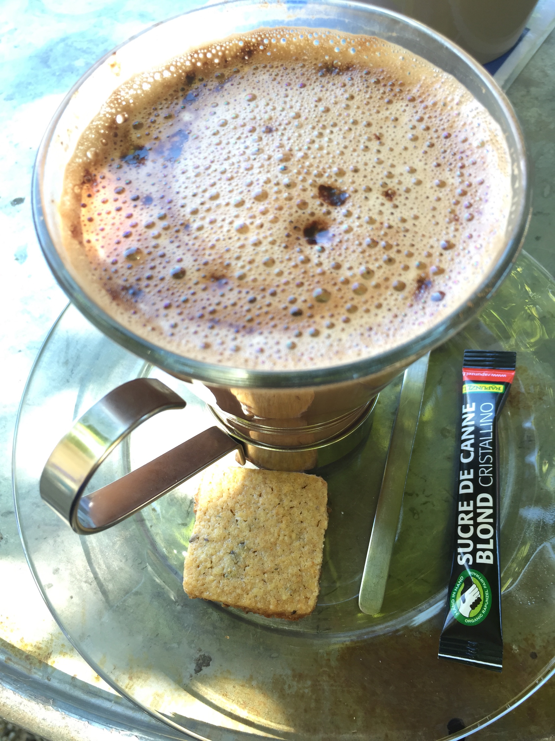 Well, all this talk of herbs (and the image in our heads of freshly made crepes) was making us hungry and thirsty, so we wandered over to the little aromatic bar and ordered two lavender honey crepes, a lavender hot chocolate, a lavender espresso and a glass of fresh lavender/apple juice. We enjoyed our treats outside in the shade of a large tree.