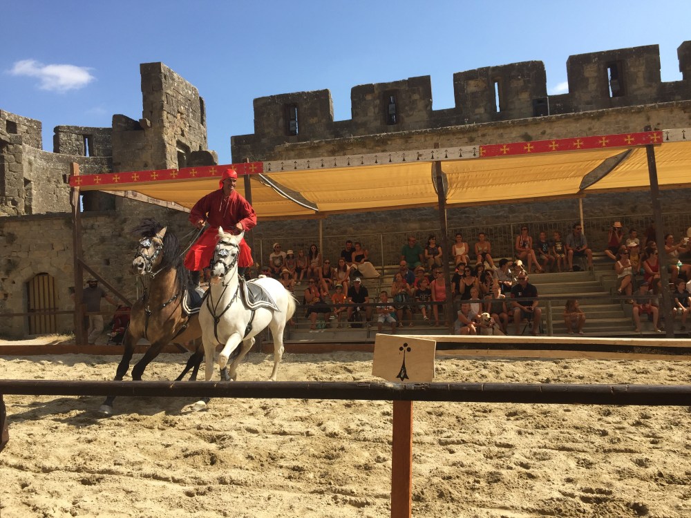 After the church, we cooled down with a couple of bottles of water and some scoops of ice cream while we waited for the afternoon jousting. When it was time, we walked back out to the alley between the inner and outer ramparts and were eventually showed into a small arena, flanked on either side with shaded bandstands. We took our seats on the one of the long benches in the bandstands and soon the entertainment began.