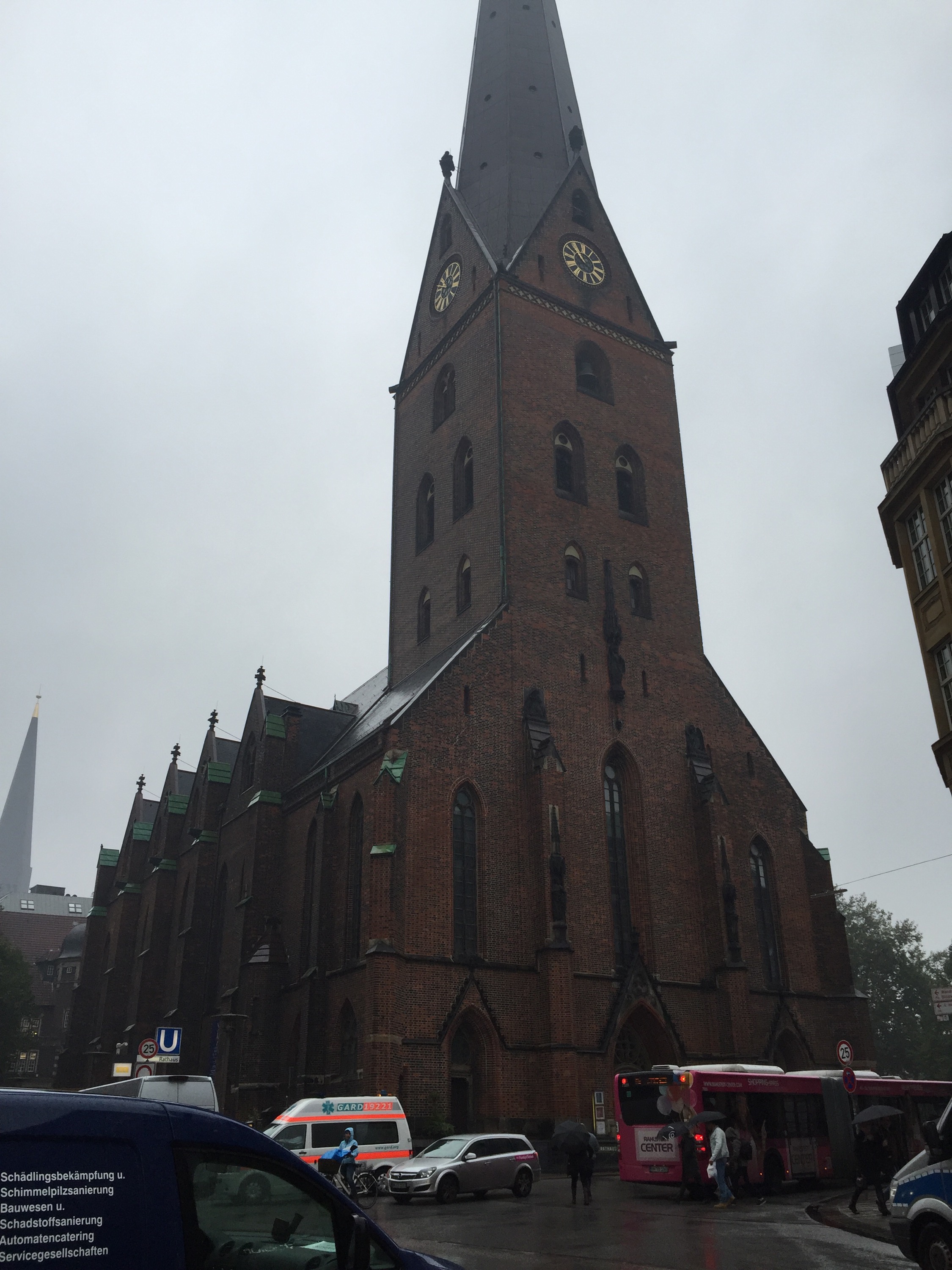 After watching the birds for a while, I made my way down Mönckebergstraße towards Hauptkirche St. Petri (St. Peter’s Church). This church dates back to 1195, though much of it was destroyed by a big fire in 1842. A new church was built to replace it in 1849 (according to the background sheet I picked up there). The Lutheran church was much more simple than the Catholic churches we’ve been visiting in France and Spain, but beautiful just the same.