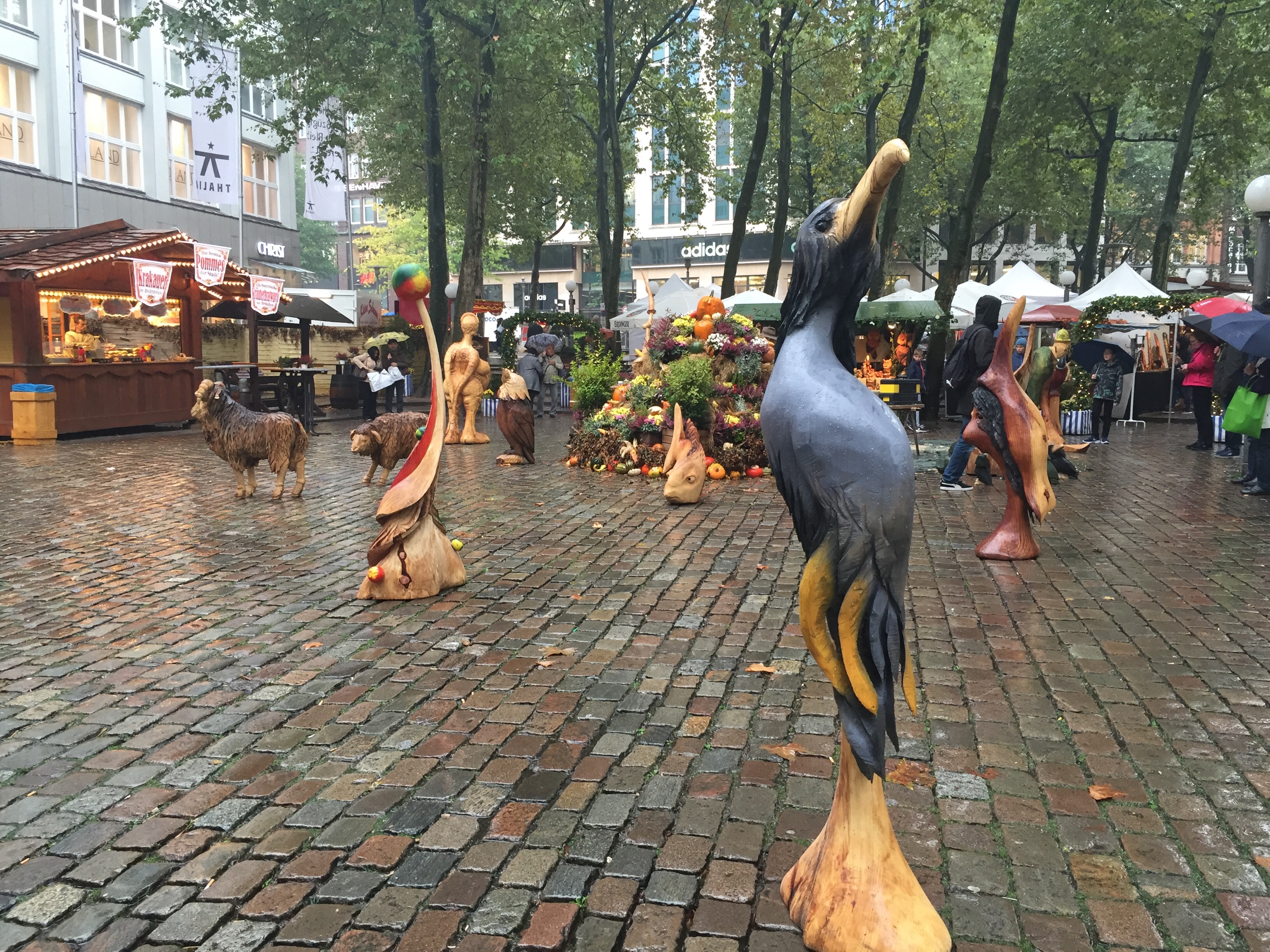 I eventually came across a park with a cute little art market set up. A carver in the middle was working with his chainsaw to create beautiful wooden sculptures. Other stands held hand-crafted jewelry, paintings, silks and spices. There were a couple of food stands selling Gluhwein (hot, spiced wine) and Schmalzkuchen (little donut holes sprinkled with powdered sugar).