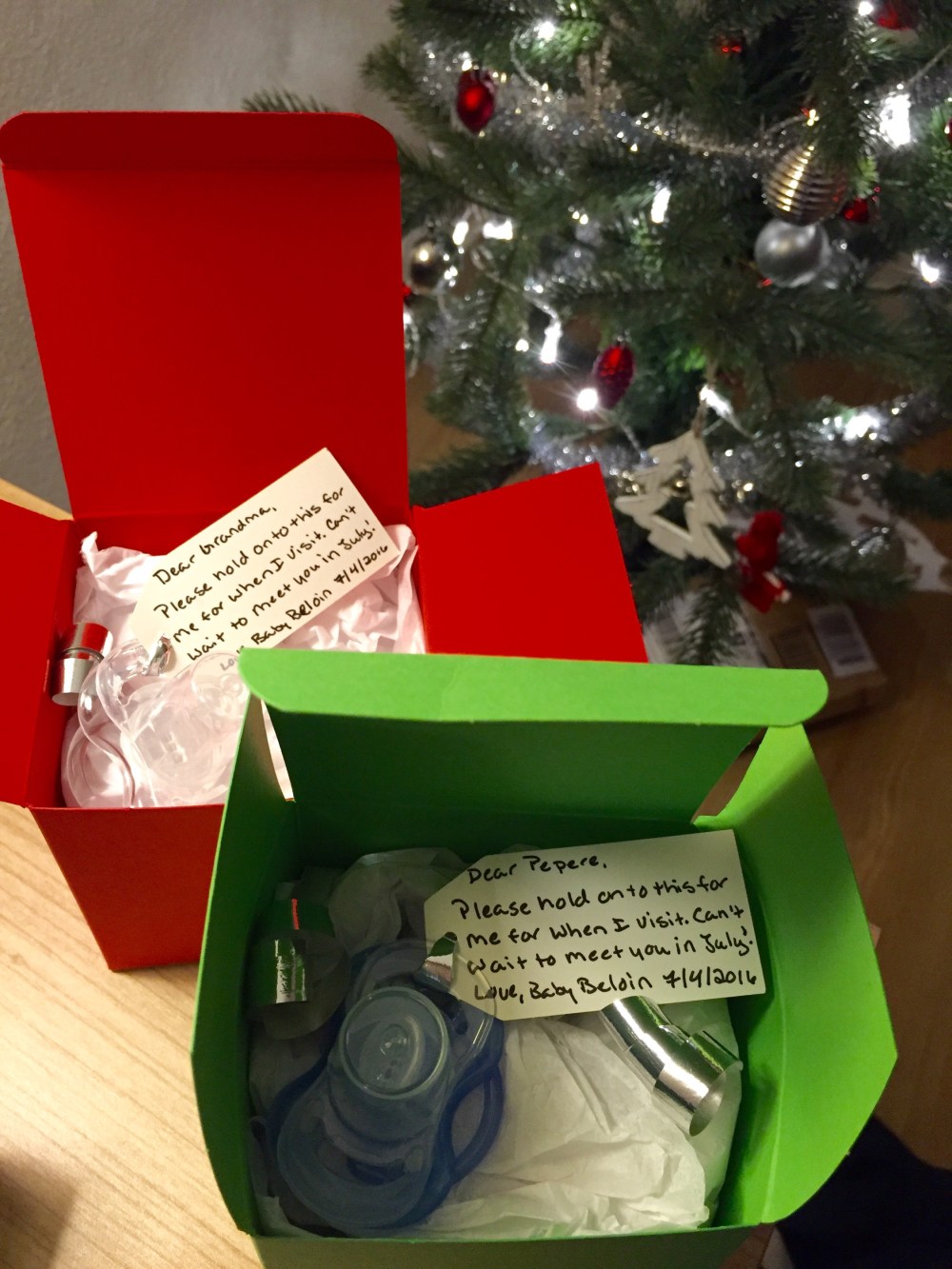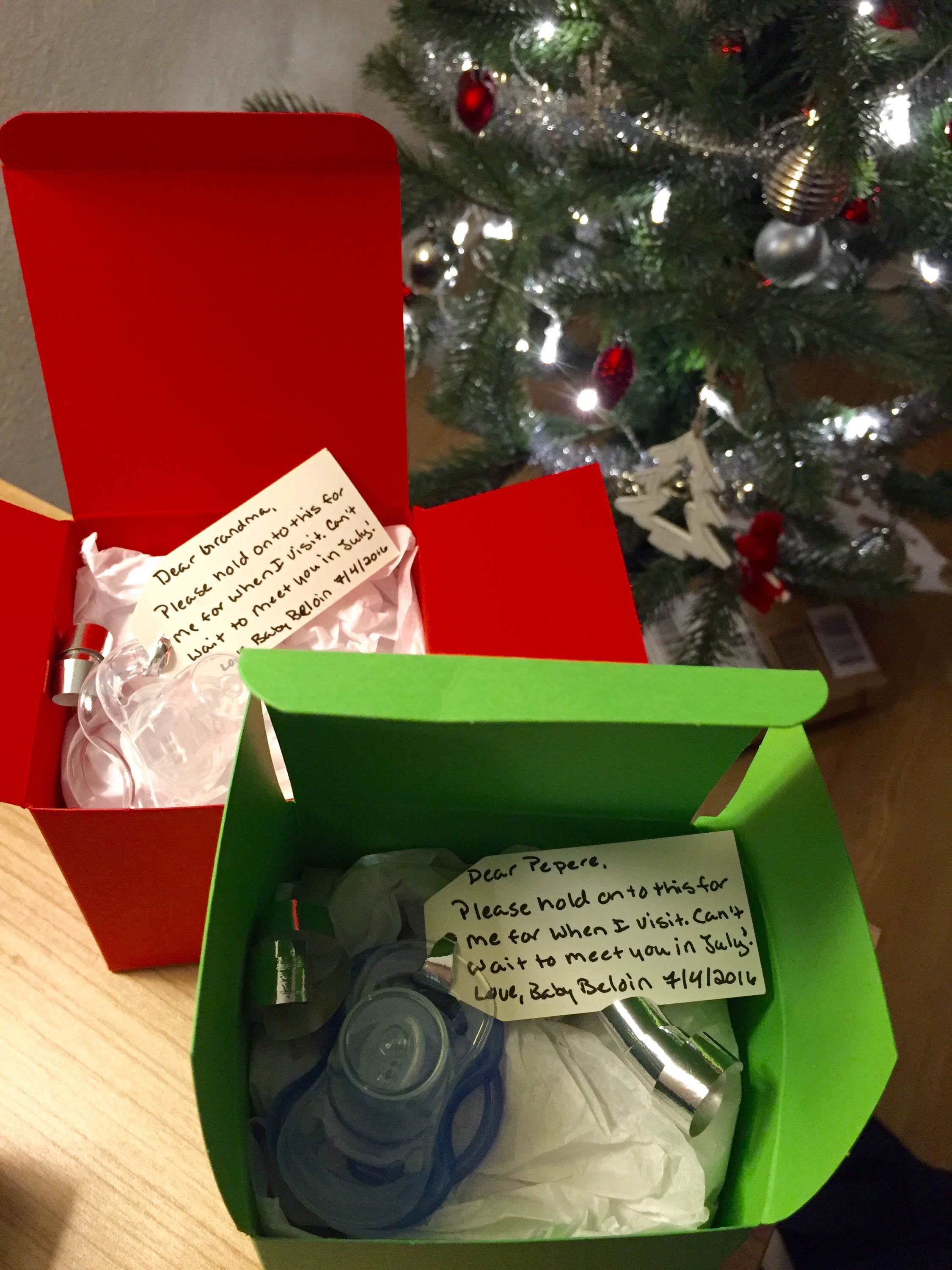 We were sad we wouldn’t be able to share the news in person (with everything going on at Matt’s job, we couldn’t plan a home trip), so brainstormed ways to creatively share the news. In the end, we sent little gifts to both my parents and Matt’s family announcing our coming addition. We Skyped with both families Christmas Eve and watched their reactions as they opened the gifts and realized what they meant. Everyone was happy and surprised, though both of our mothers had their suspicions (Matt’s mom had even already crocheted a cute, little baby blanket).