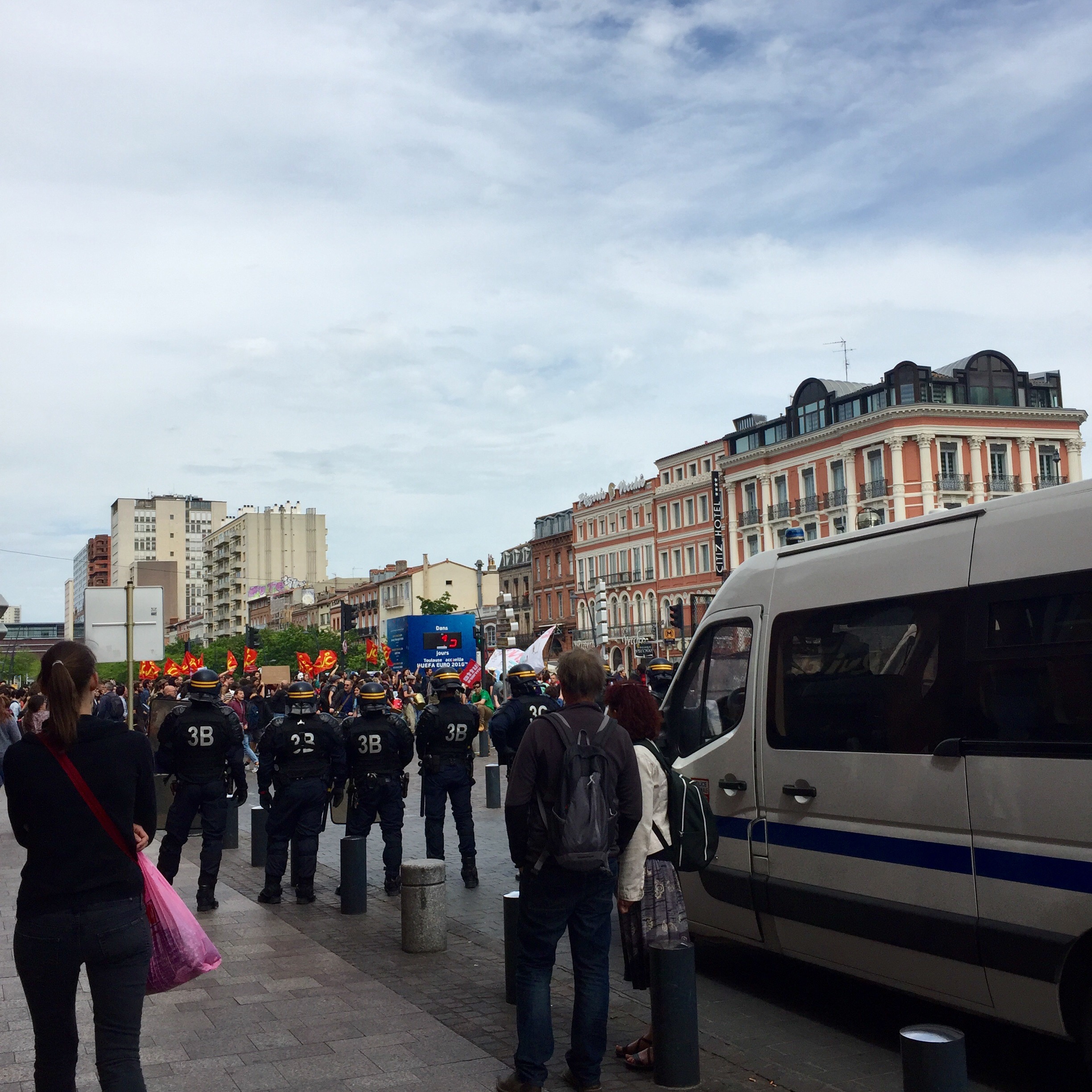 The protests here can get pretty heated, so the police are out in full force, many in full-body protective suits and carrying shields. It’s kind of intimidating to see–but I guess that’s the point.