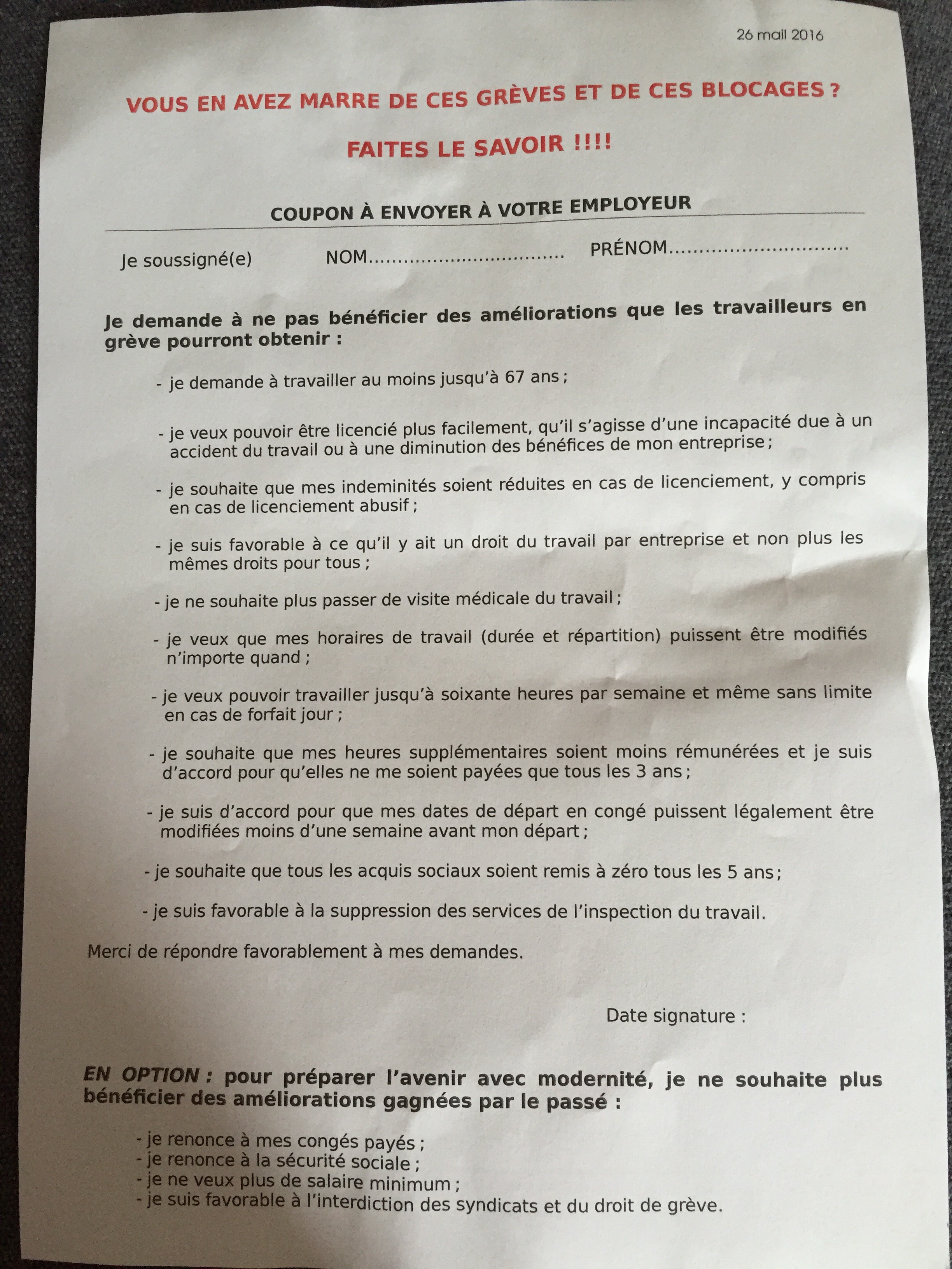 A man walking with the protest handed me a letter the protestors want given to employers with terms they approve. This includes wanting the ability to work until at least 67-years-old, not wanting to have to pass a medical exam to work and wanting to be able to modify work schedules whenever necessary.
